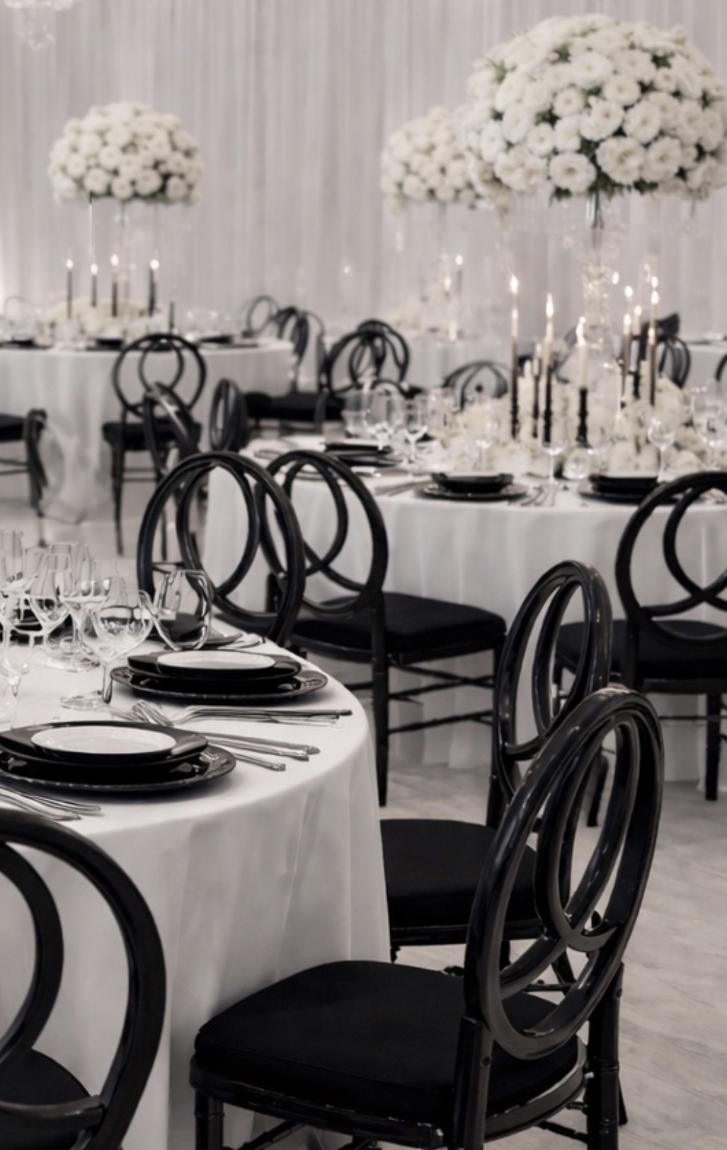 Dodajte svojej svadbe či eventu moderný luxus a nadčasový štýl. Čierne stoličky sú jednoducho dokonalé