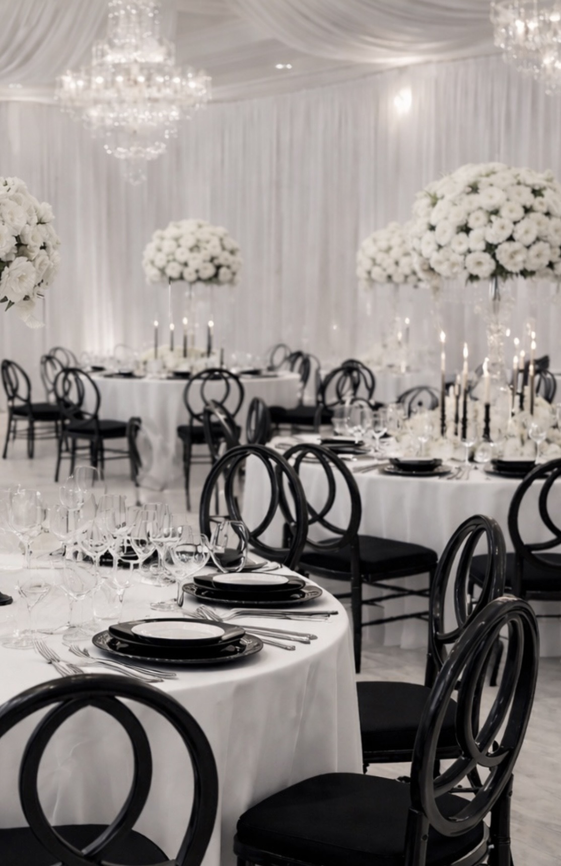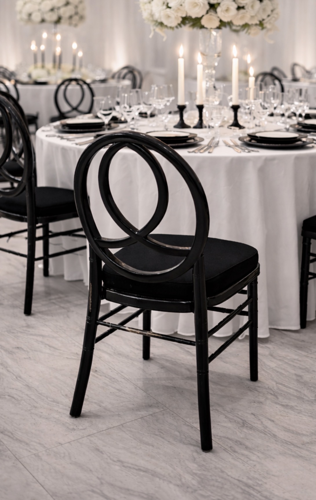 Tieto elegantné čierne stoličky s ikonickým oblým operadlom sú ideálnou voľbou pre moderné, romantické aj minimalistické svadby či eventy